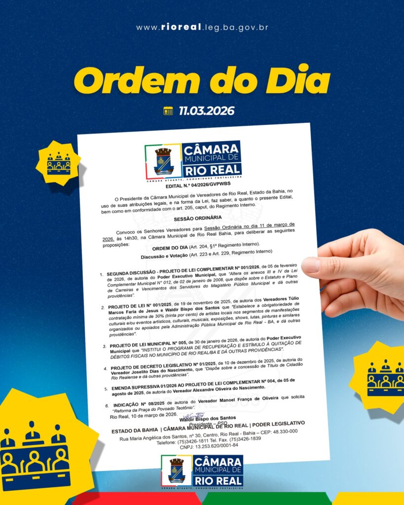 A pauta inclui ainda o Projeto de Decreto Legislativo nº 01/2025, que trata da concessão de Título de Cidadão Rio Realense, além de uma emenda supressiva e a Indicação nº 08/2025, que solicita a reforma da Praça do Povoado Teotônio, atendendo demandas da comunidade local.