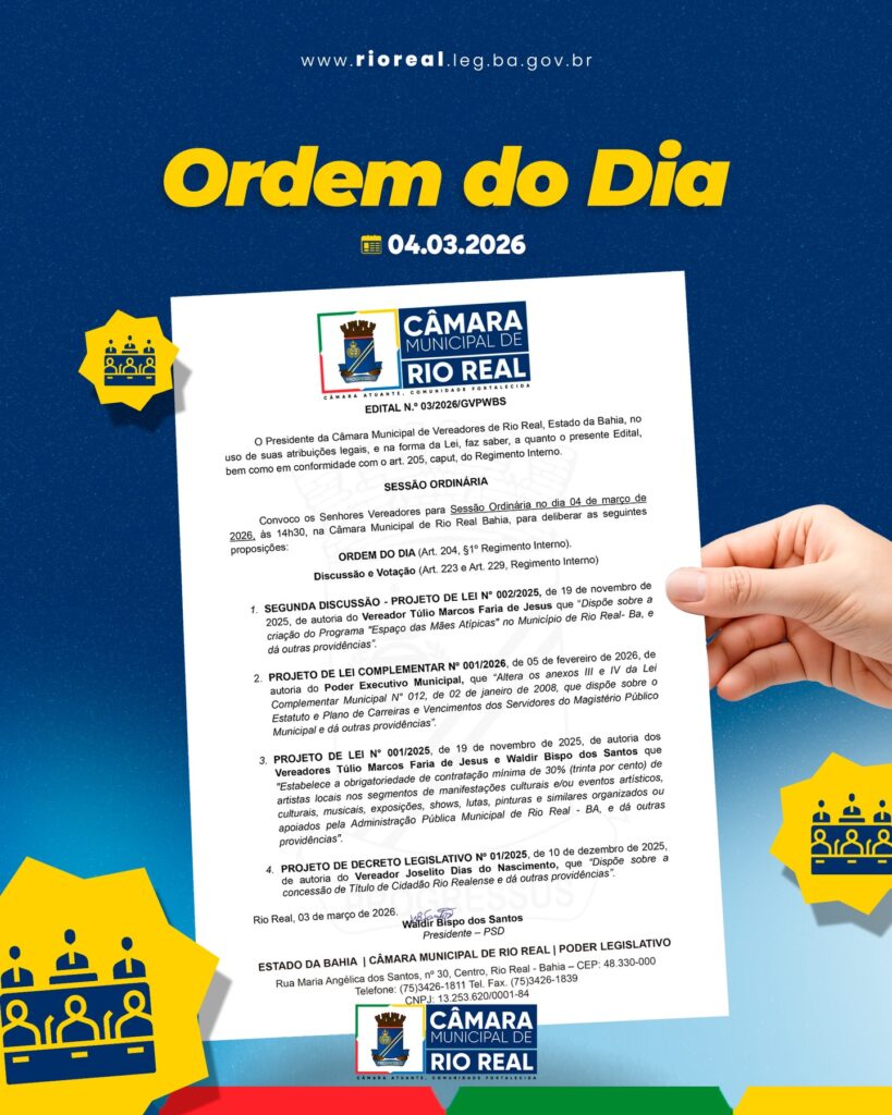 A Câmara Municipal de Rio Real realiza, no dia 04 de março de 2026, às 14h30, mais uma Sessão Ordinária com importantes projetos em pauta para discussão e votação.
