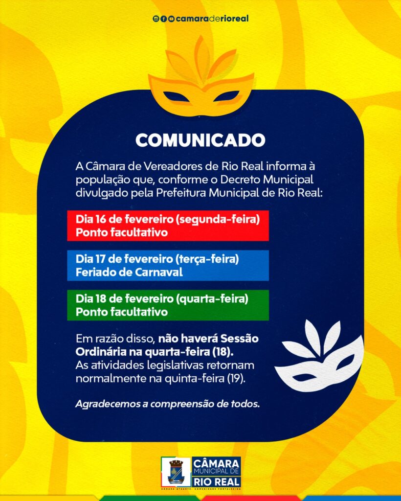 A Câmara Municipal de Rio Real informou à população que, conforme decreto divulgado pela Prefeitura Municipal de Rio Real, haverá alterações no funcionamento das atividades legislativas durante o período de Carnaval.